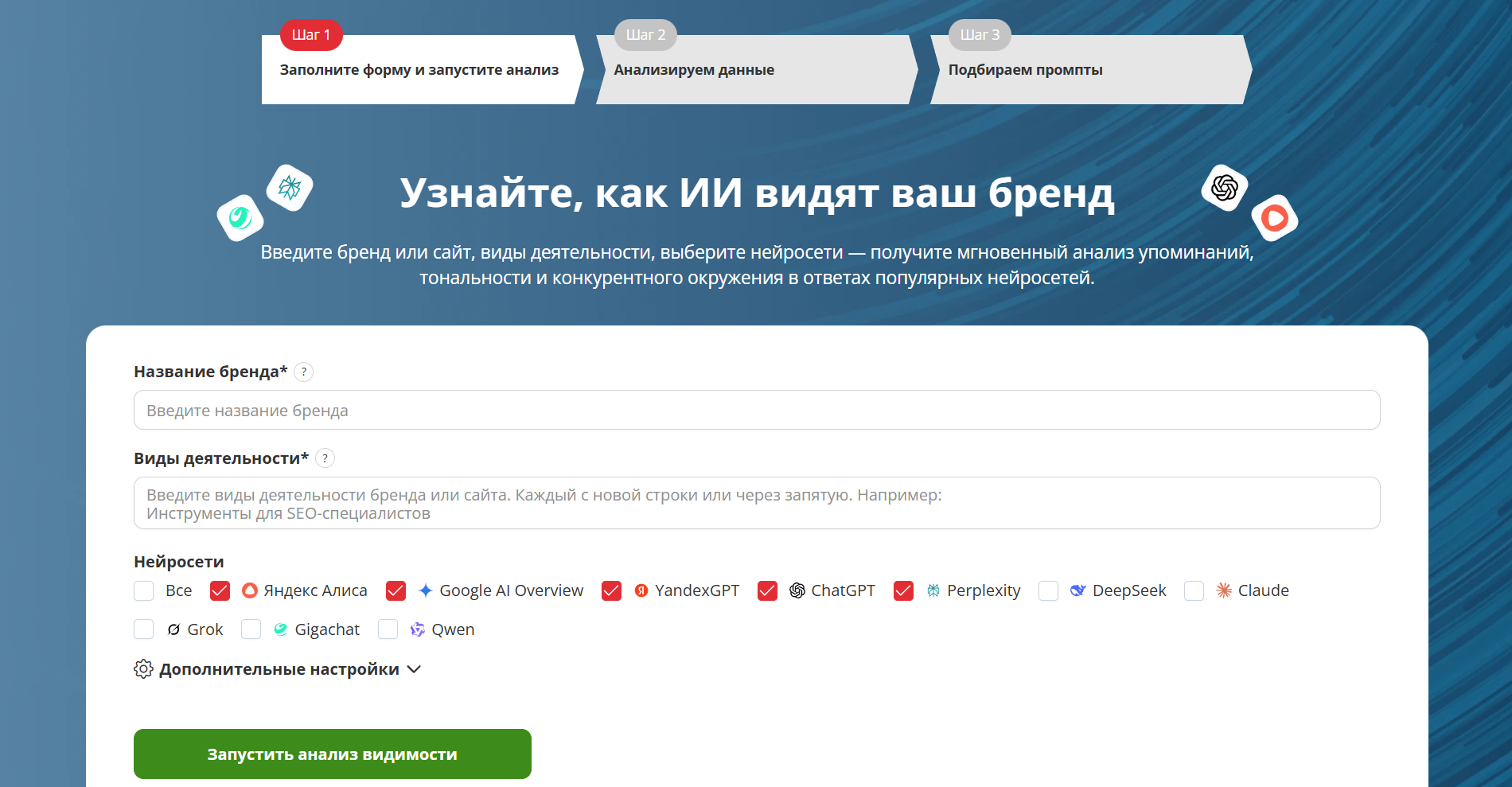 - появляется ли бренд в ответах нейросетей по профильным запросам;