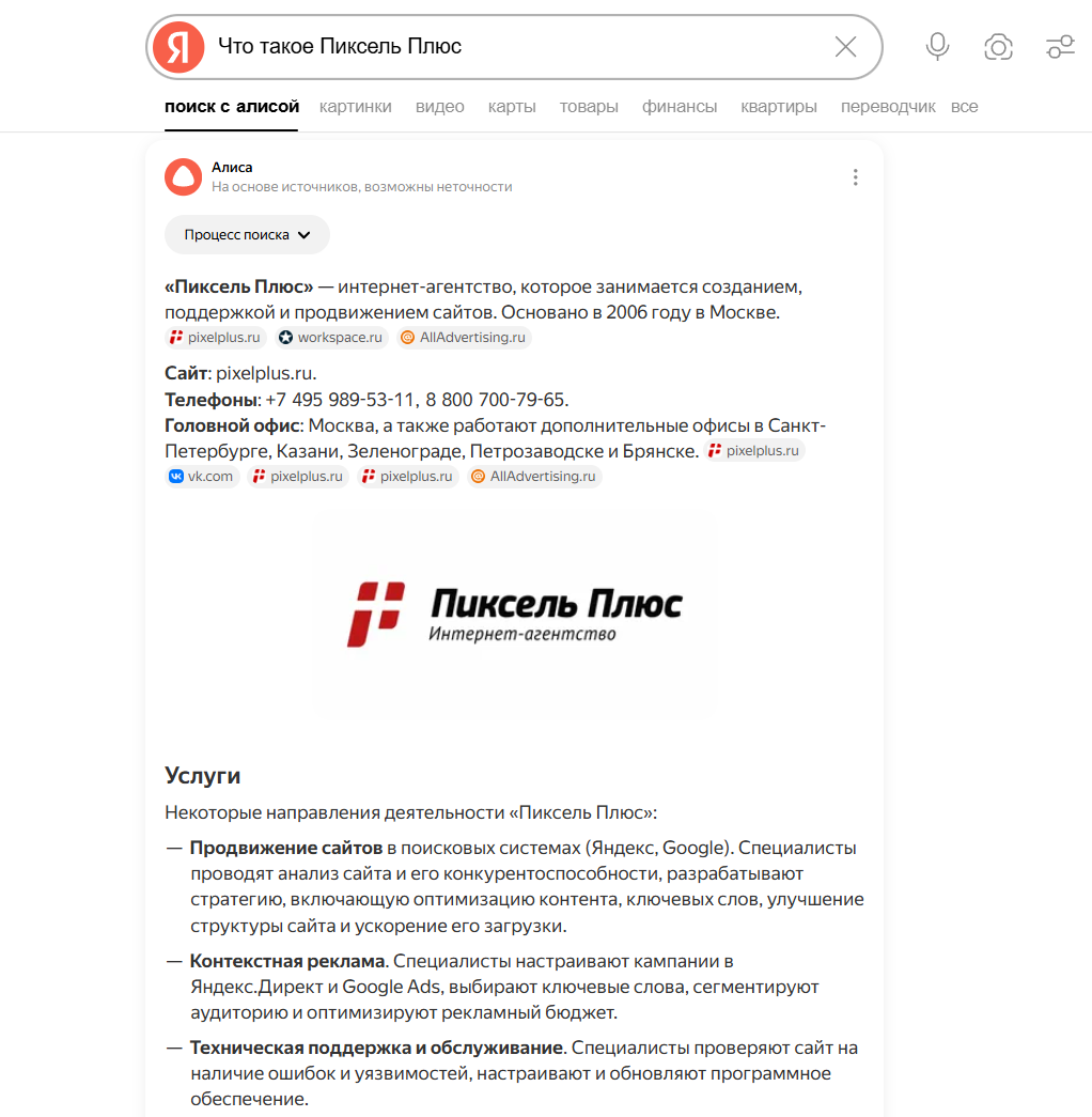 Нейросети работают не только с актуальными страницами сайта. Они опираются на весь массив информации о бренде, который доступен в открытых источниках: старые статьи, кейсы, публикации в СМИ, партнерские материалы, архивные версии страниц. Для ИИ-моделей вроде ChatGPT это особенно критично, поскольку представление о компании формируется на основе накопленных данных.