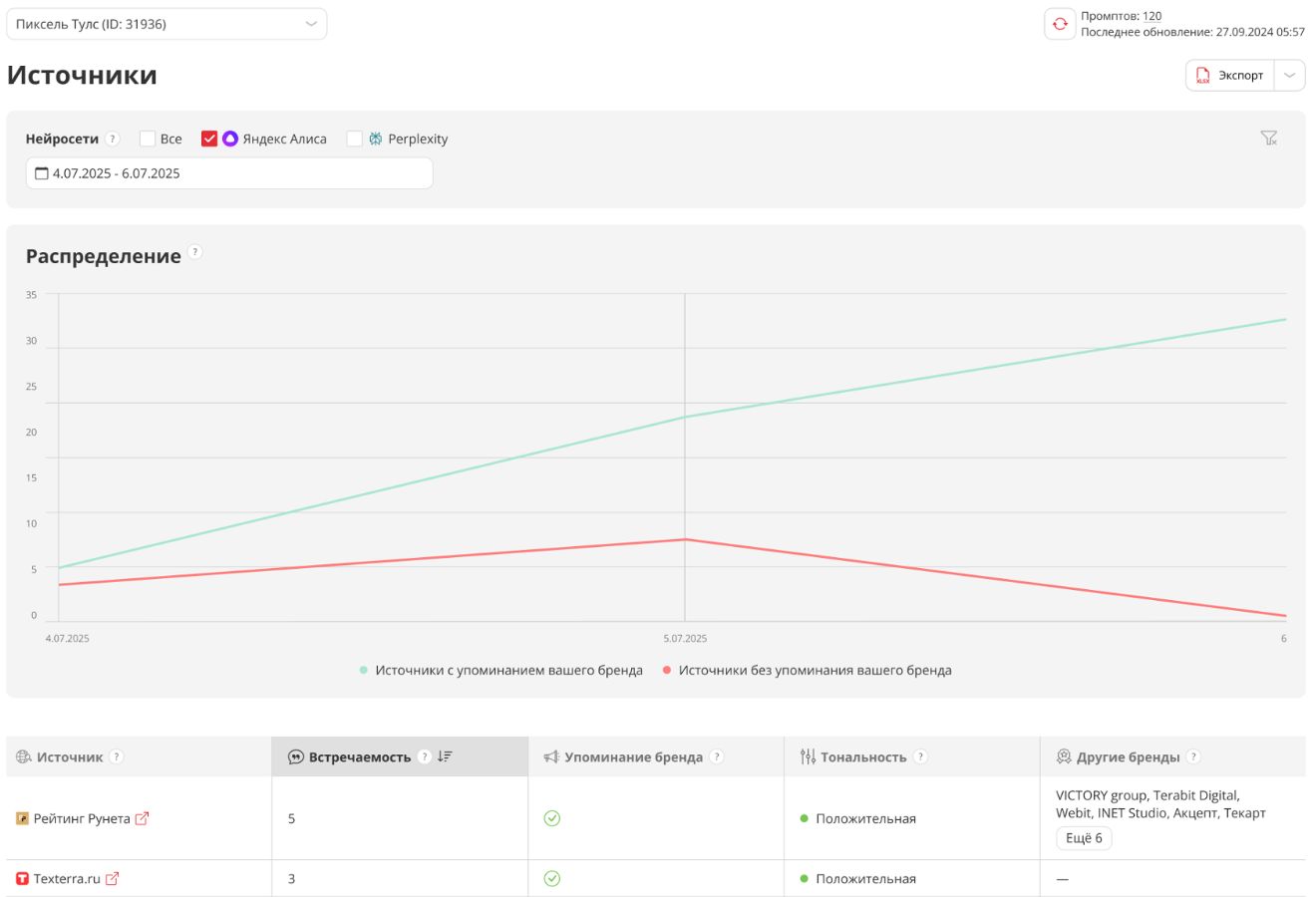 Проверьте, как ваш бренд выглядит глазами нейросетей, с помощью инструмента анализа видимости от Пиксель Тулс. Он помогает выявить ошибки, искажения и устаревшие данные, чтобы скорректировать образ компании до того, как он закрепится в AI-ответах.